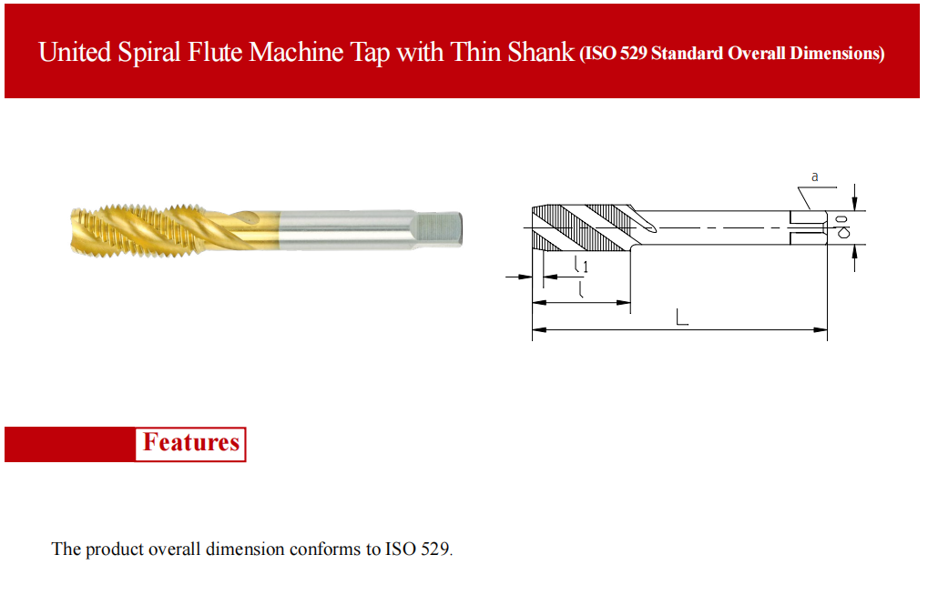 PRODUCT current location:Home > PRODUCT > United Spiral Flute Machine Tap with Thin Shank (ISO529 Standard Overall Dimensions)