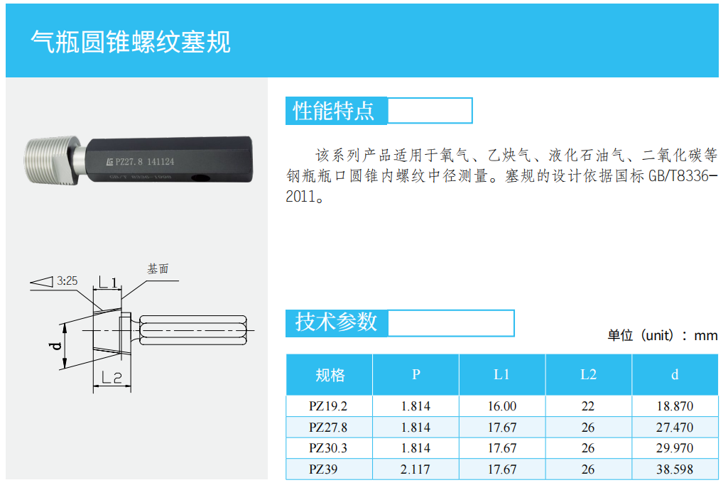 該系列產(chǎn)品適用于氧氣、乙炔氣、液化石油氣、二氧化碳等鋼瓶瓶口圓錐內(nèi)螺紋中徑測量。塞規(guī)的設(shè)計(jì)依據(jù)國標(biāo)GBT8336-2011.