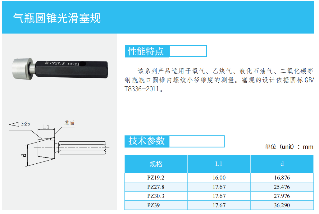 該系列產(chǎn)品適用于氧氣、乙炔氣、液化石油氣、二氧化碳等鋼瓶瓶閥尾部圓錐外螺紋中徑測(cè)量,環(huán)規(guī)的設(shè)計(jì)依據(jù)國(guó)標(biāo)GB/T8336-2011。