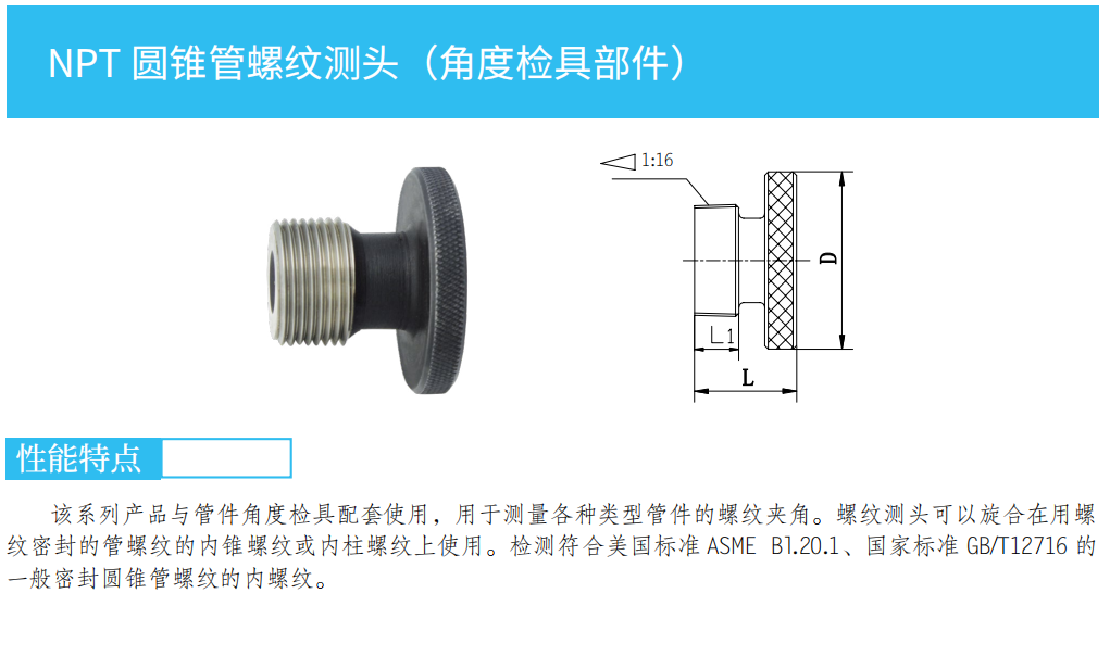 該系列產(chǎn)品與管件角度檢具配套使用,用于測(cè)量各種類型管件的螺紋夾角。螺紋測(cè)頭可以旋合在用螺紋密封的管螺紋的內(nèi)錐螺紋或內(nèi)柱螺紋上使用。檢測(cè)符合美國(guó)標(biāo)準(zhǔn) ASME B1.20.1、國(guó)家標(biāo)準(zhǔn) GB/T12716 的一般密封圓錐管螺紋的內(nèi)螺紋。