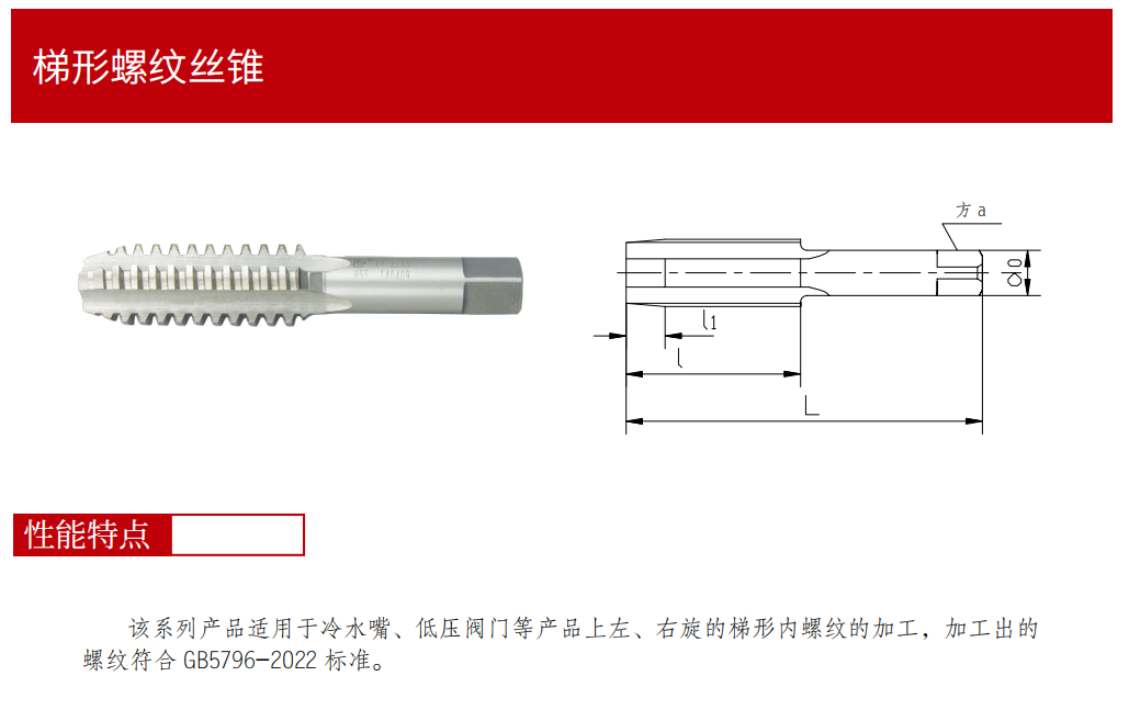 該系列產(chǎn)品適用于冷水嘴、低壓閥門等產(chǎn)品上左、右旋的梯形內(nèi)螺紋的加工,加工出的螺紋符合 GB5796-2005 標(biāo)準(zhǔn)。