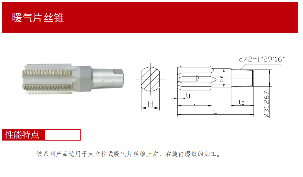 該系列產(chǎn)品適用于大立柱式暖氣片絲錐上左、右旋內(nèi)螺紋的加工。