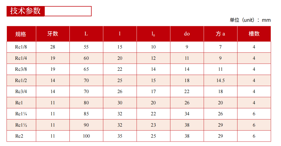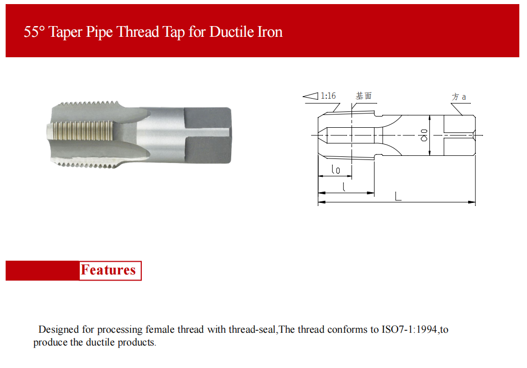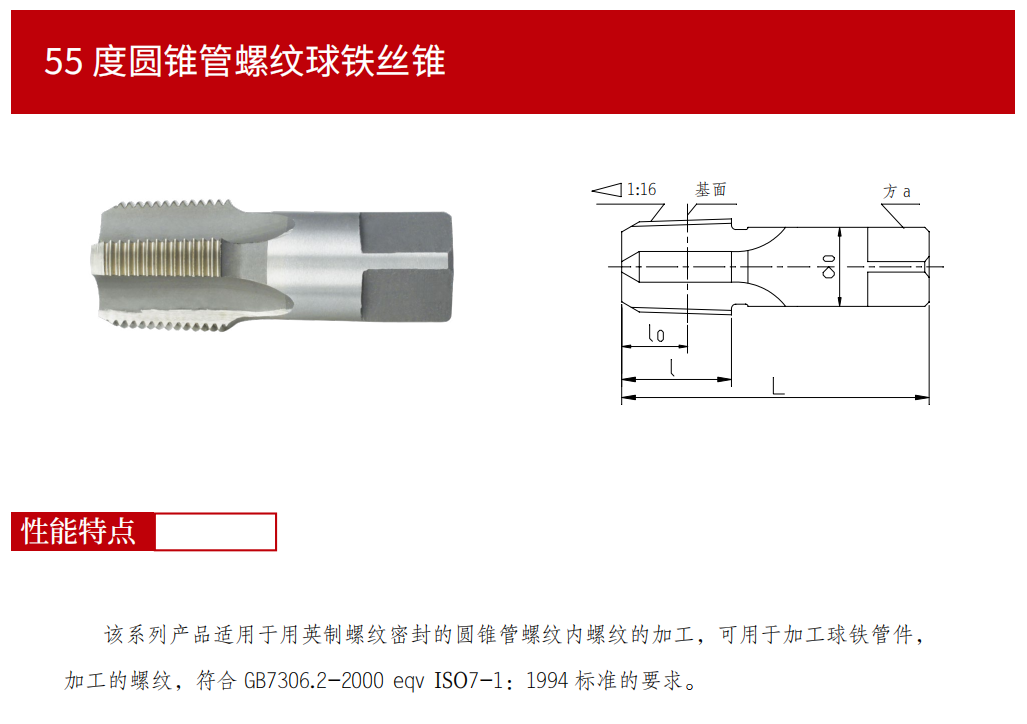 該系列產品適用于用英制螺紋密封的圓錐管螺紋內螺紋的加工,可用于加工球鐵管件,加工的螺紋,符合GB7306.2-2000 eqv ISO7-1:1994標準的要求。