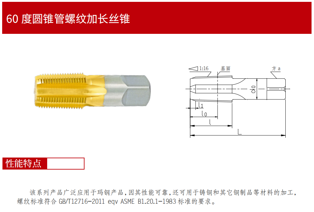 該系列產(chǎn)品適用于美制螺紋密封的圓錐管螺紋內(nèi)螺紋的加工,可用于加工球鐵件加工的螺紋,符合GB/T12716-2011 eqv ASME B1.20.1-1983標(biāo)準(zhǔn)的要求。