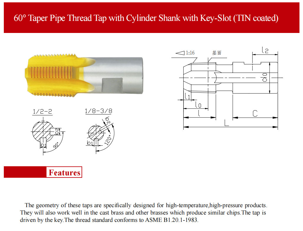 該系列產(chǎn)品用于用螺紋密封的高溫、高壓管路連接件內(nèi)螺紋的加工,該絲錐用鍵傳遞動力,并有安裝倒角刀槽,用圓柱面定位,加工出的螺紋符合ASME B1.20.1-1983及 GB/T12716-2011 標準的要求。