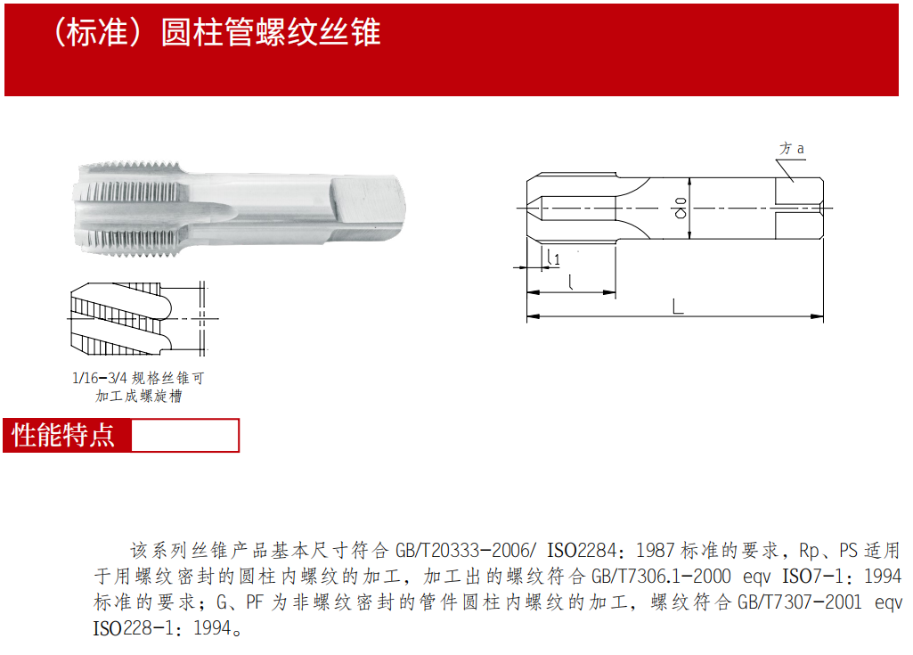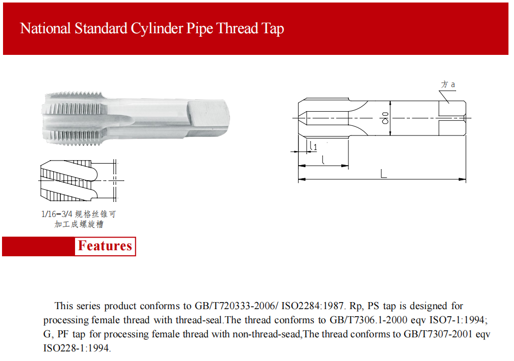 該系列絲錐產(chǎn)品基本尺寸符合 GB/T20333-2006/IS02284:1987 標(biāo)準(zhǔn)的要求,Rp 適用于用螺紋密封的圓柱內(nèi)螺紋的加工,加工出的螺紋符合 GB/T7306.1-2000 eav IS07-1:1994 標(biāo)準(zhǔn)的要求G為非螺紋密封的管件圓柱內(nèi)螺紋的加工,螺紋符合 GBT7307-2001 eqv IS0228-1:1994 。
