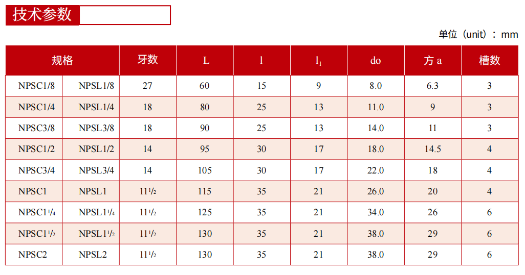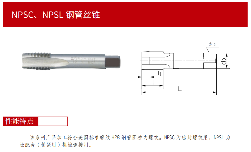 該系列產(chǎn)品加工符合美國標(biāo)準(zhǔn)螺紋H28鋼管圓柱內(nèi)螺紋。NPSC為密封螺紋用,NPSL為松配合(鎖緊用)機(jī)械連接用。