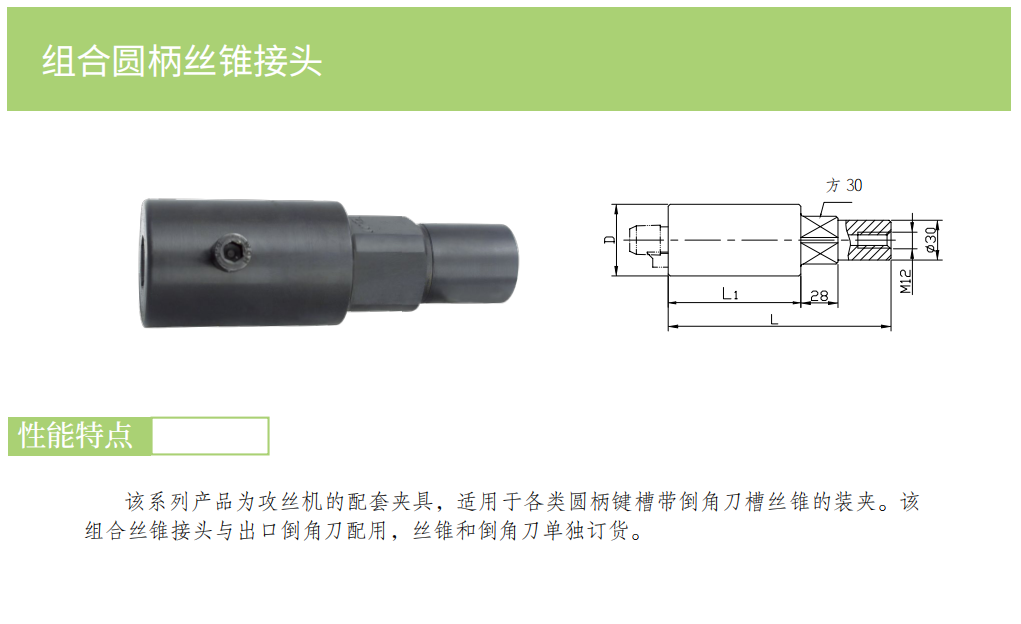 該系列產(chǎn)品為攻絲機的配套夾具,適用于各類圓柄鍵槽帶倒角刀槽絲錐的裝夾。該組合絲錐接頭與出口倒角刀配用,絲錐和倒角刀單獨訂貨。
