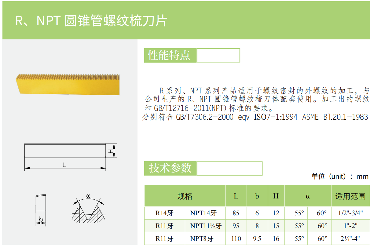R系列、NPT系列產(chǎn)品適用于螺紋密封的外螺紋的加工,與公司生產(chǎn)的R、NPT圓錐管螺紋梳刀體配套使用。加工出的螺紋分別符合GB/T7306.2-2000 eqv ISO7-1:1994 ASME B1.20.1-1983和GB/T12716-2002(NPT)標準的要求。
